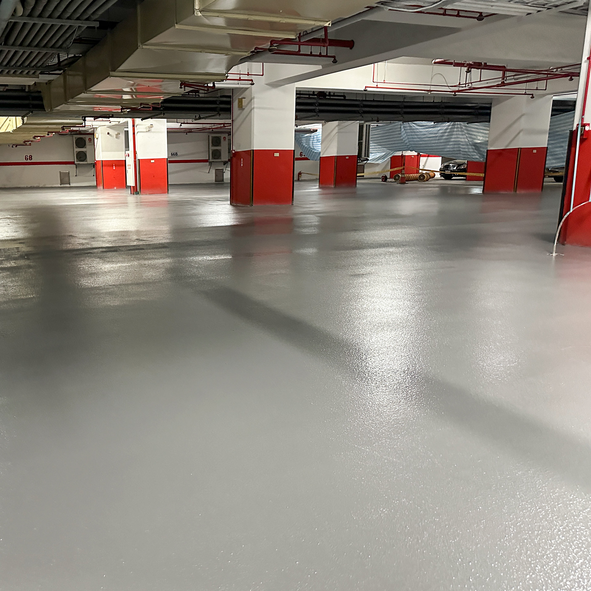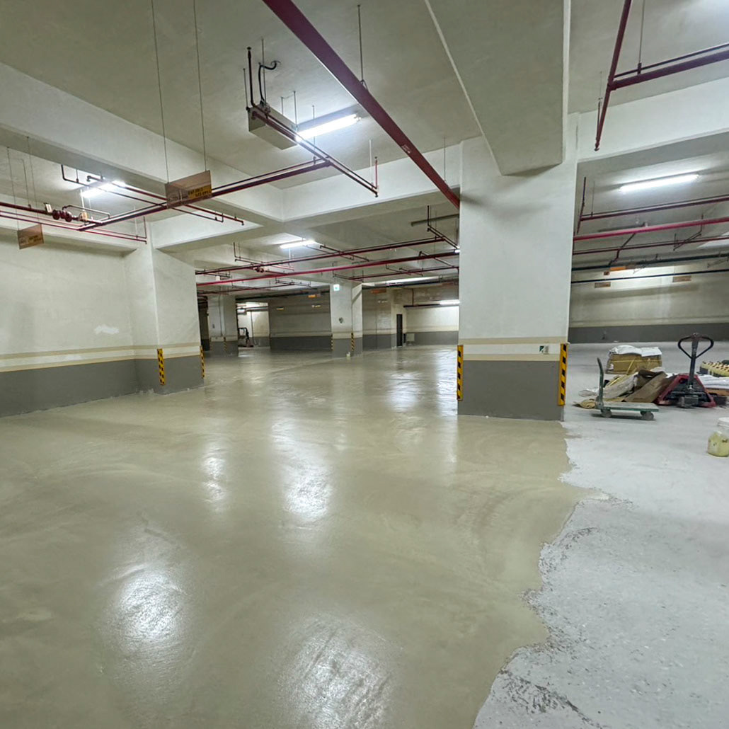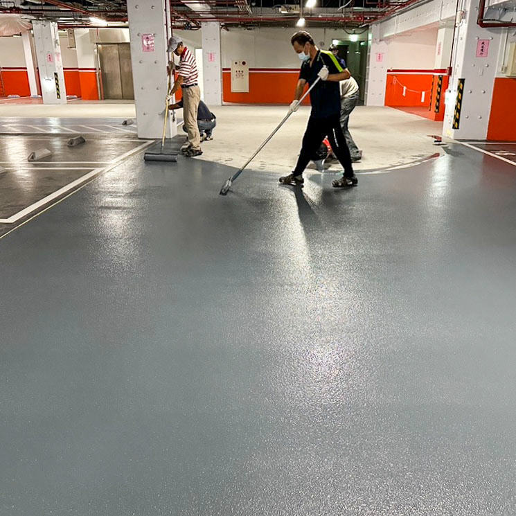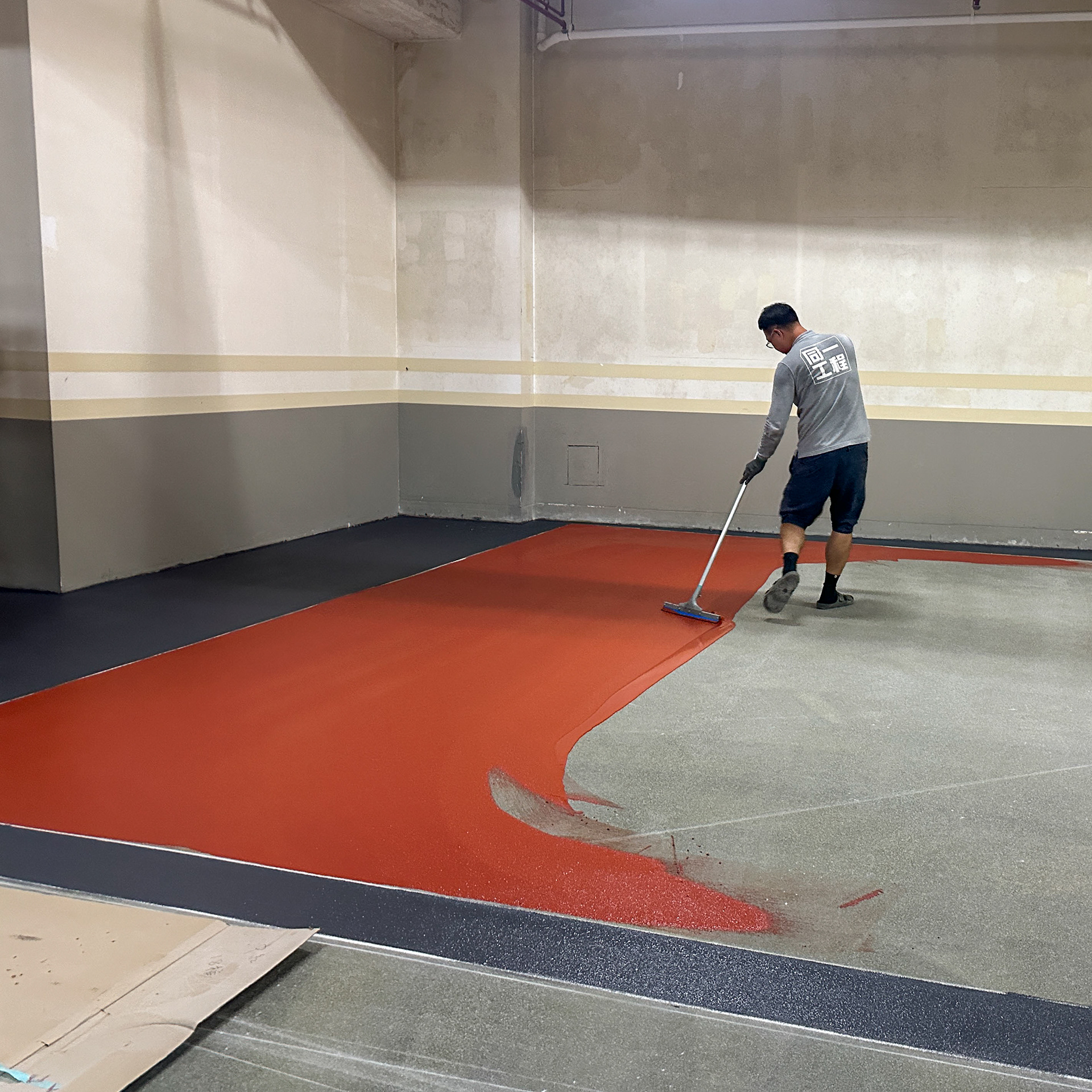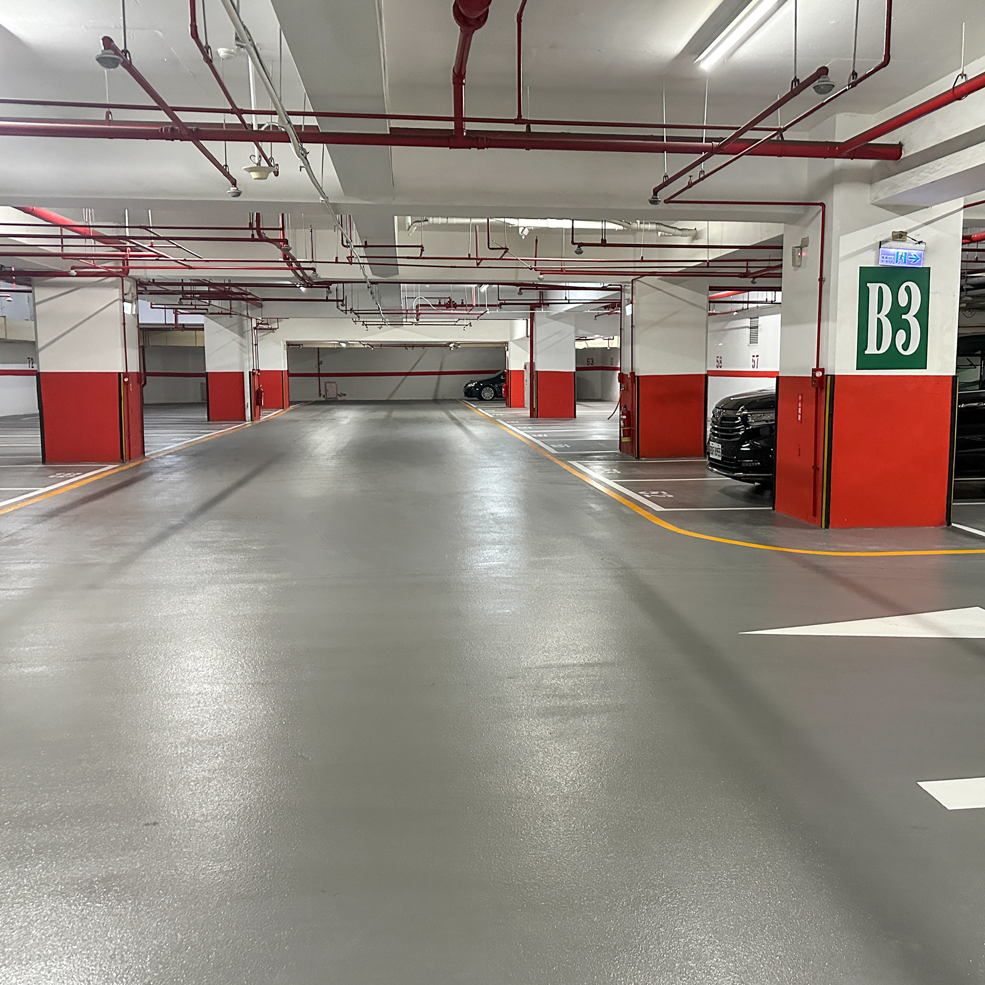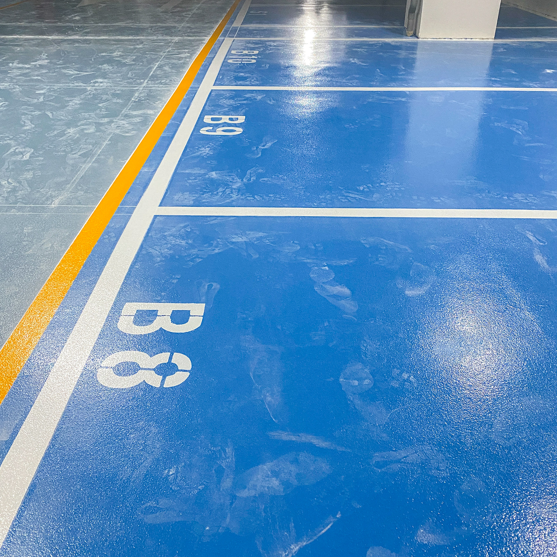 防滑且具韌性塗層,耐化學與油汙侵蝕,較一般環氧地坪耐用。