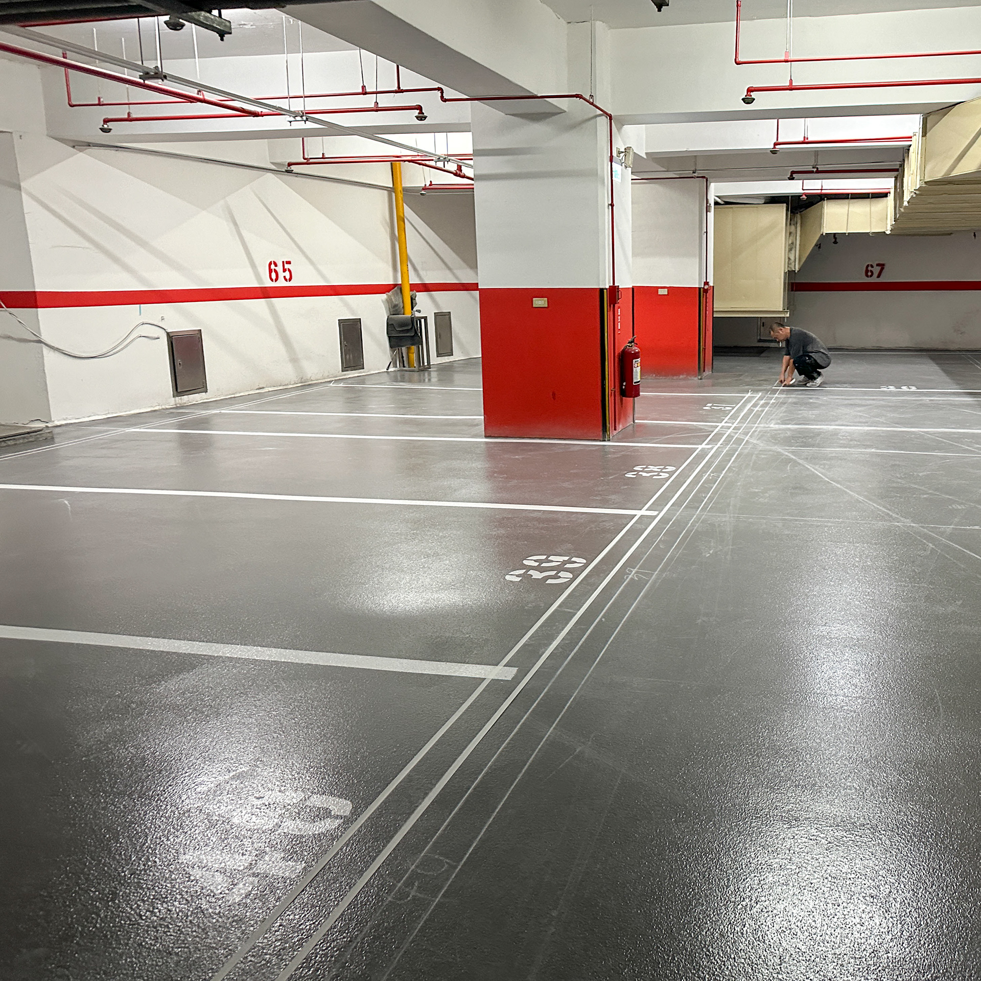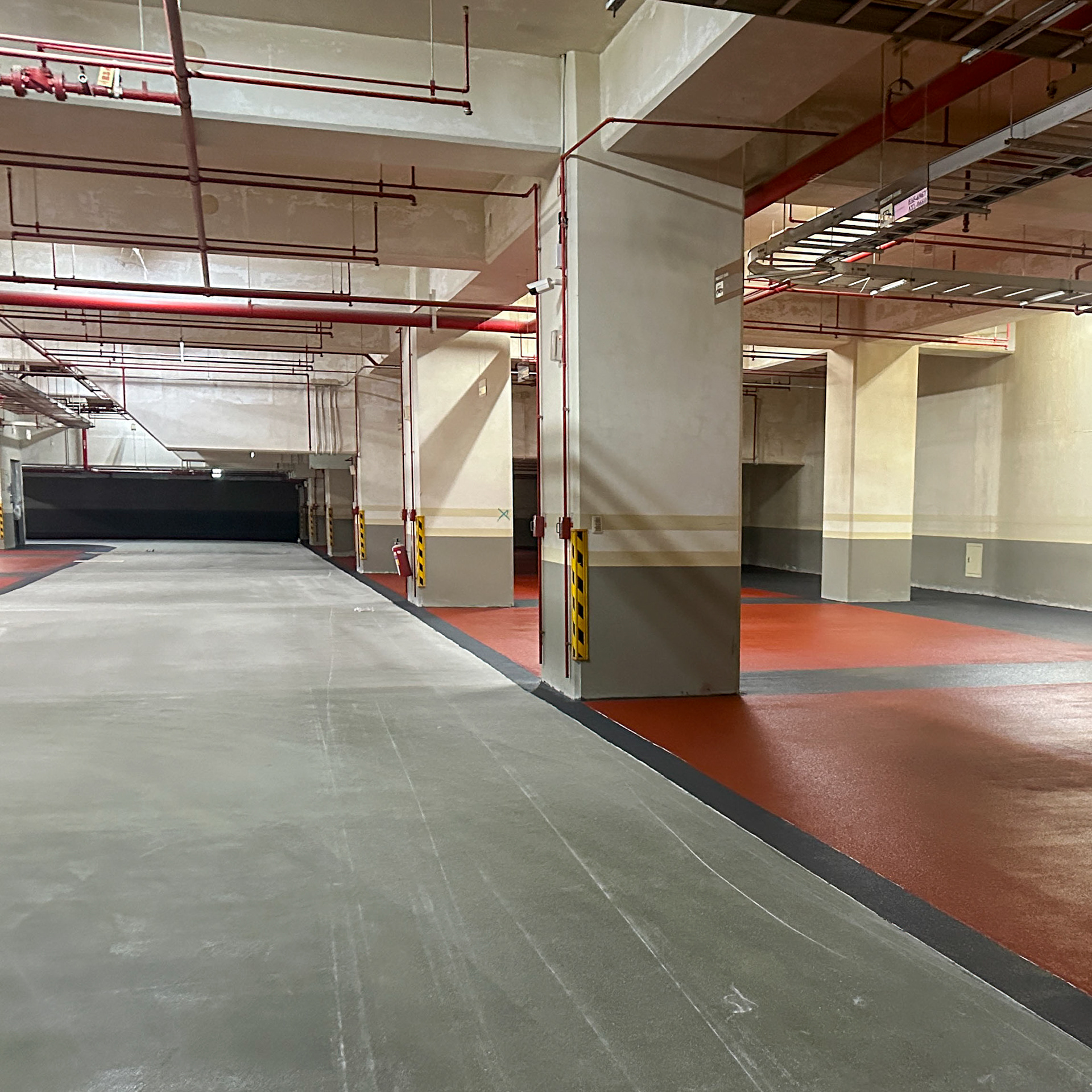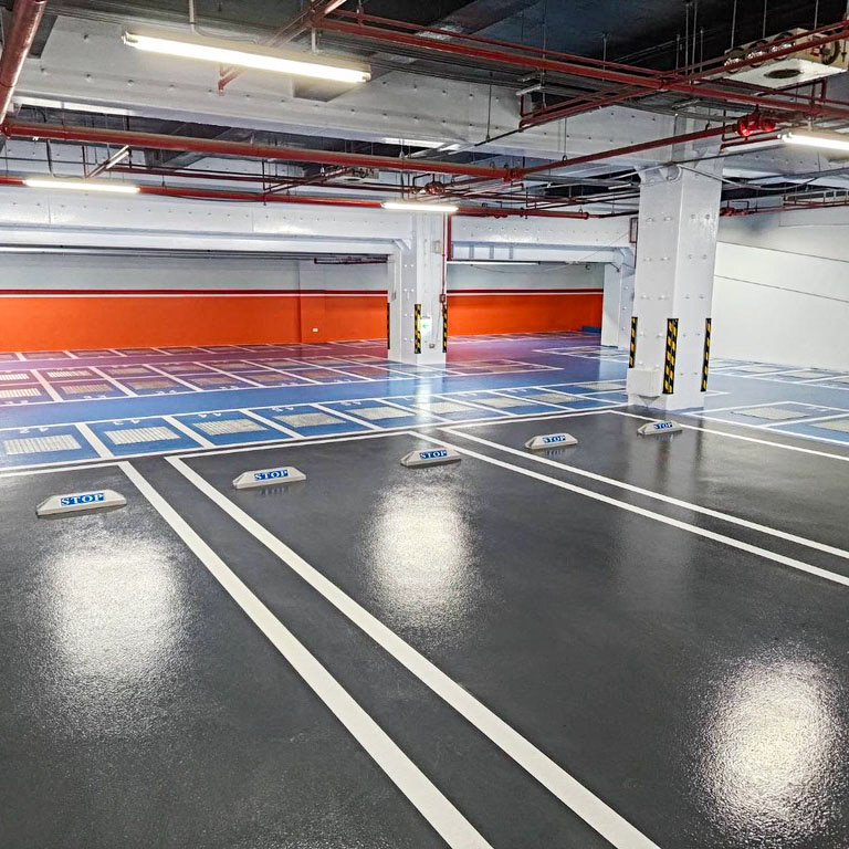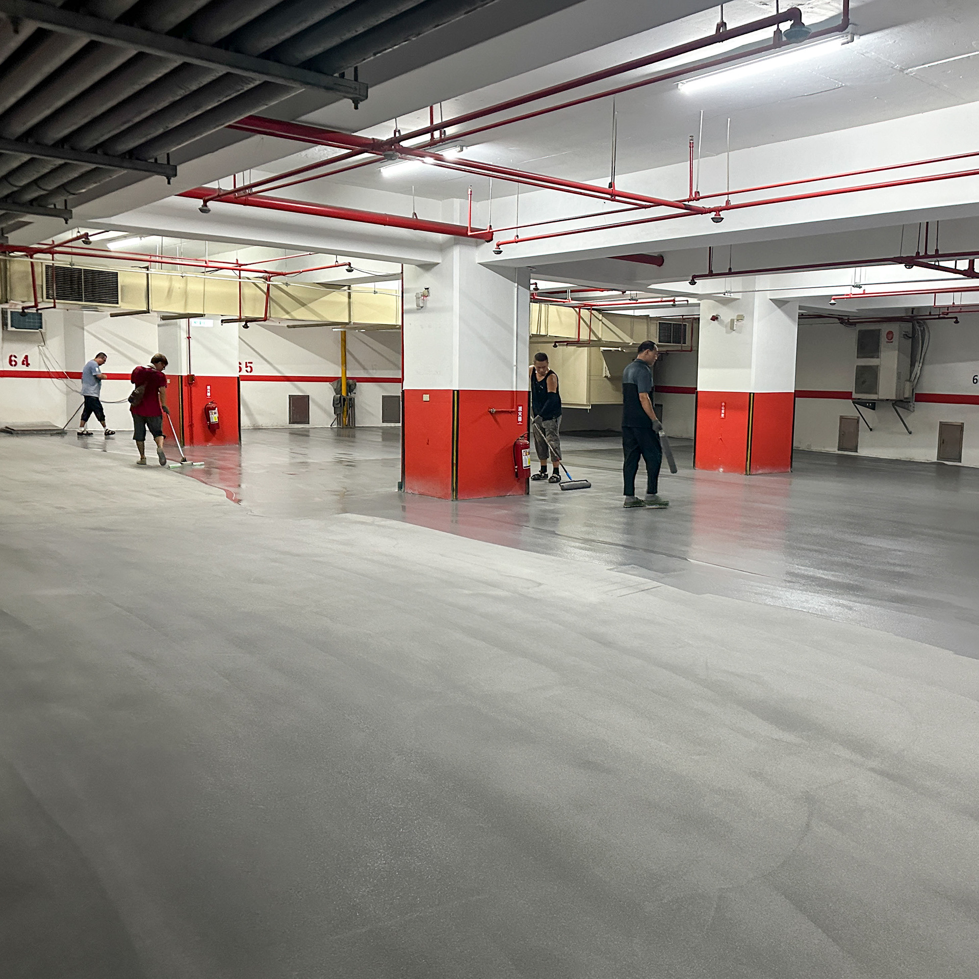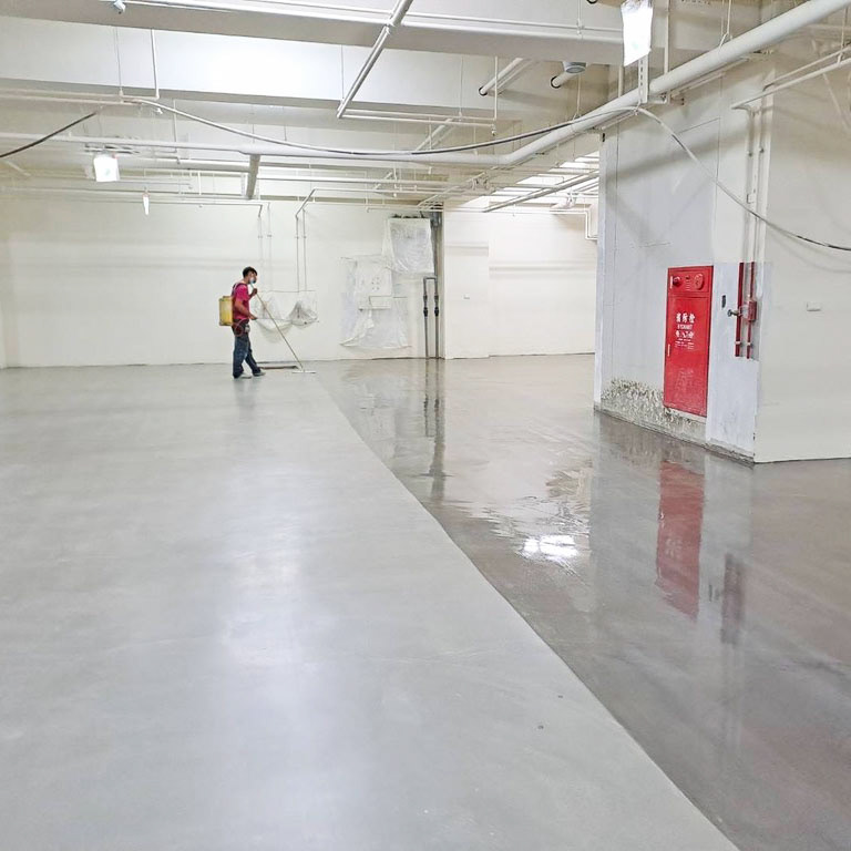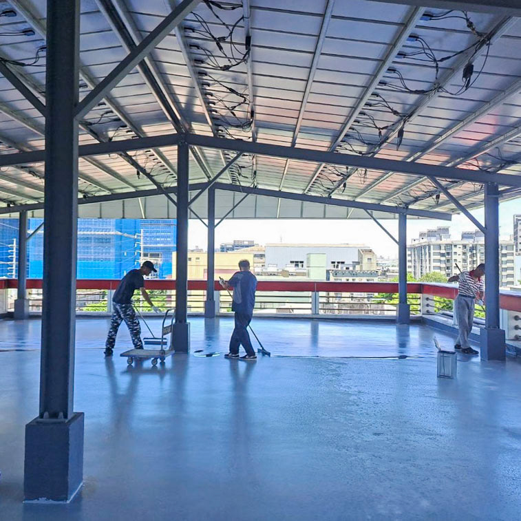 防滑且具韌性塗層,耐化學與油汙侵蝕,較一般環氧地坪耐用。